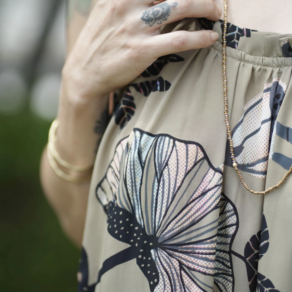 Inspirado na fluidez da natureza e na liberdade de ser, o Vestido longo Ruth traz uma estampa exclusiva de folhas e flores orgânicas, desenhadas em tons terrosos com sutis toques de luz (furtacor).